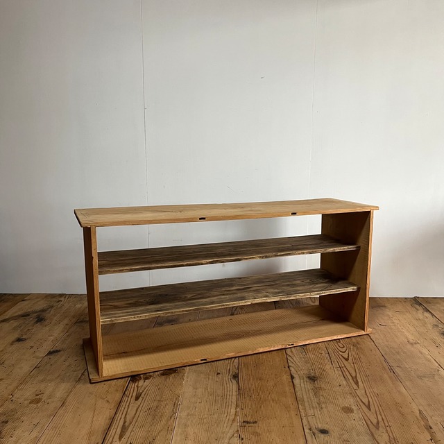 棚板は取り外し可能です。 ●サイズ 全体 幅 126.3cm 奥行き 37.5cm 高さ 59cm 棚板部分 上段 幅 116.5cm 奥行き 31.5cm 高さ 16.5cm 下段 幅 116.5cm 奥行き 29.5cm 高さ 17cm 下段 幅 116.5cm 奥行き 37cm 高さ 18.5cm ●状態 全体に傷みあり。棚板に虫食い跡あり。シンプルな構造のため、揺れあり。 *コメントについて 商品に関することはお気軽にお問い合わせ下さい。 *状態について 商品は古いものになります。キズ、シミ等ございます。写真や記載の文章からご確認ください。 清掃や手入れを行っていますが、落としきれない汚れや埃残りがあります。 *配送、梱包について サイズや重量によって、ヤマト運輸、佐川急便、おまかせ家財便のいずれかから発送いたします。 破損のないように、丁寧に梱包いたします。 壊れやすいガラス類などはリサイクル段ボールや、合板で保護します。 *その他注意点 ※計測サイズの多少の誤差はご了承下さい。 ※光の入り具合やカメラの性能によって実物と色味が多少異なる場合があります。