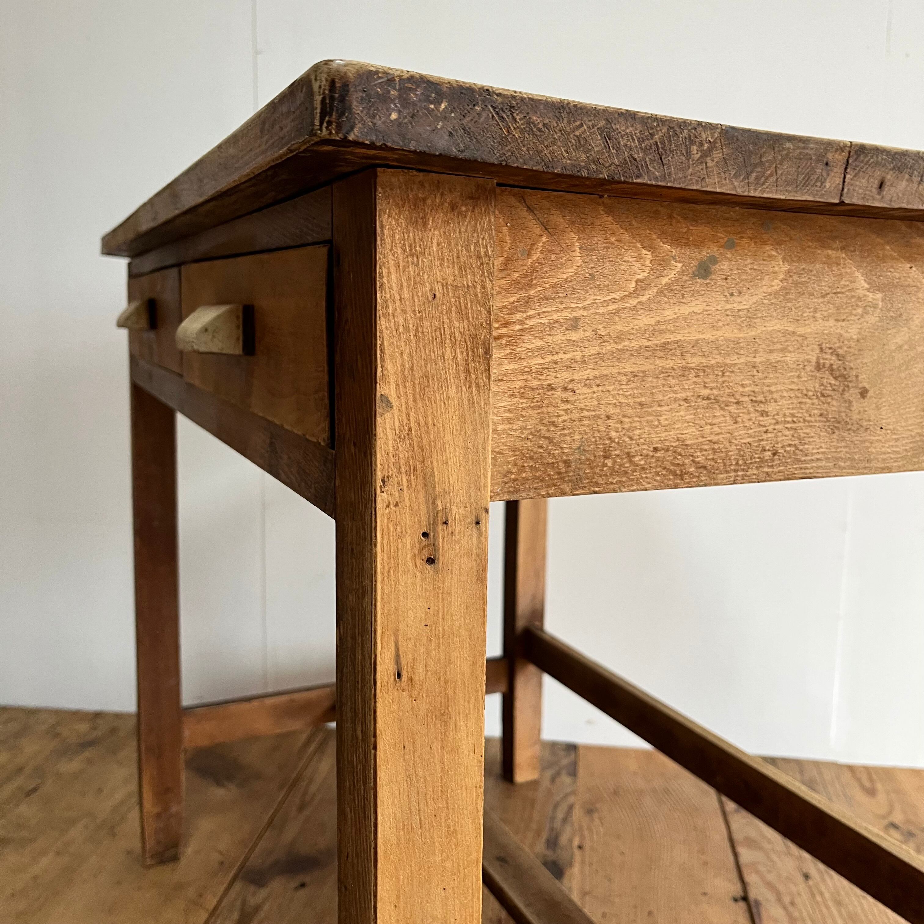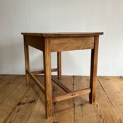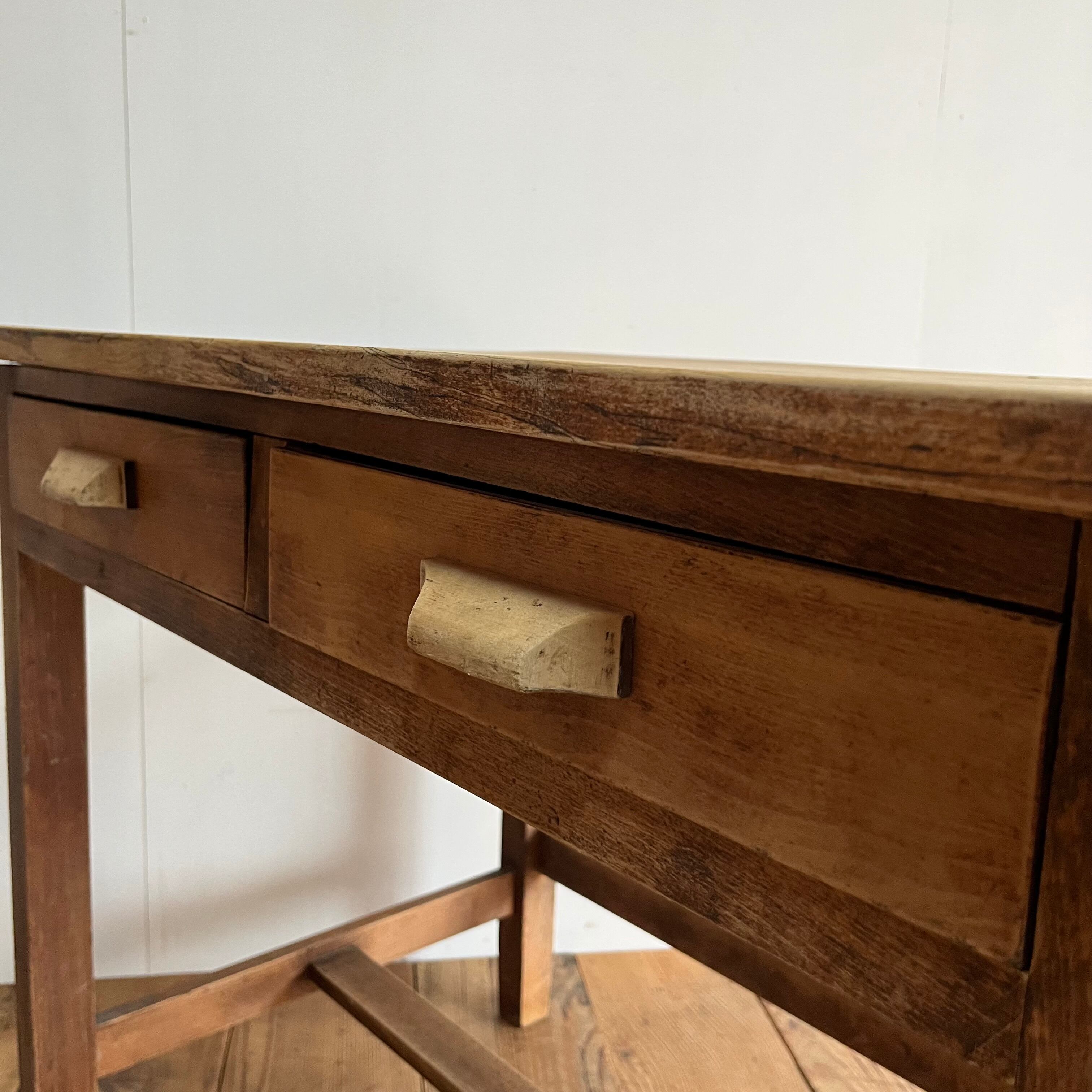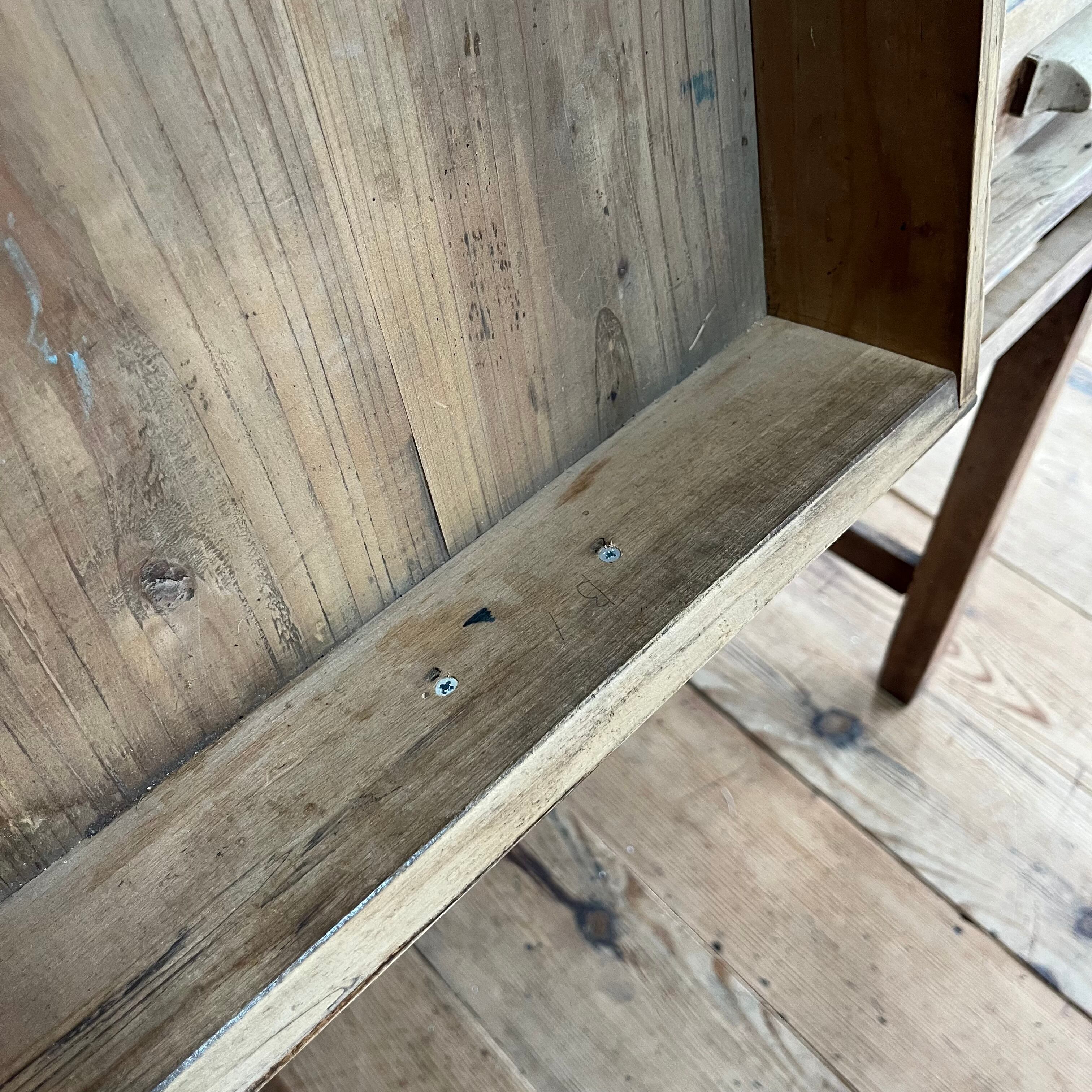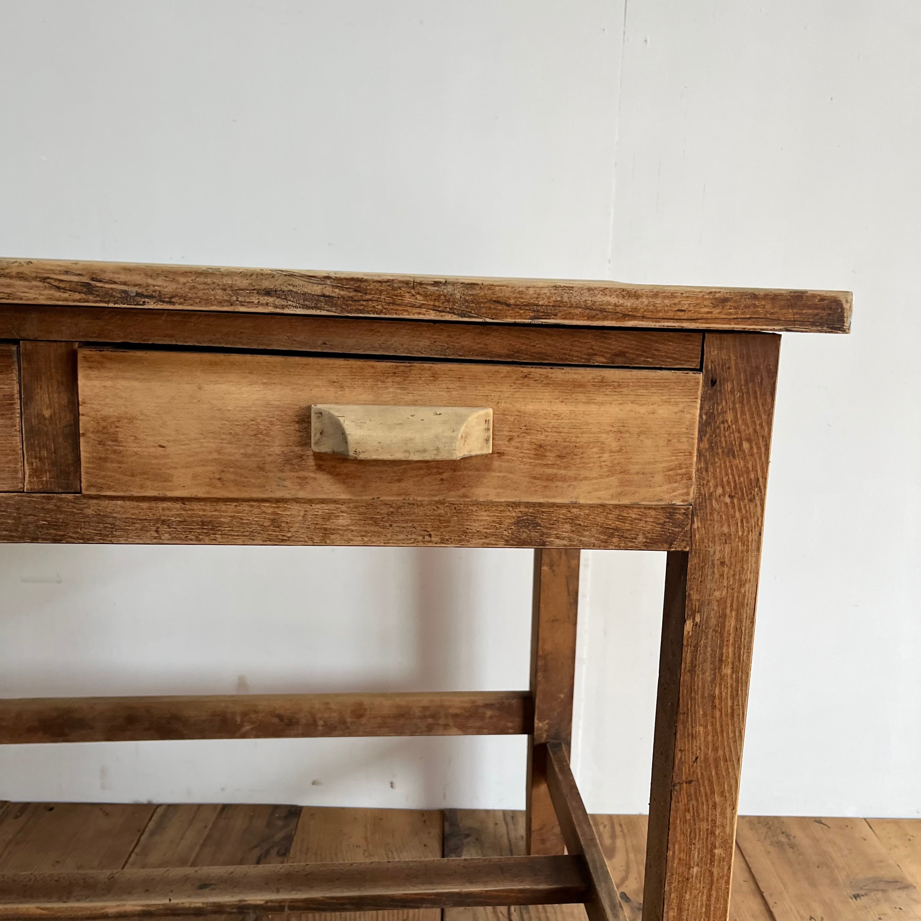 全体に傷みあり。虫食い跡あり。天板に反りあり。引き出しの開閉はスムーズです。