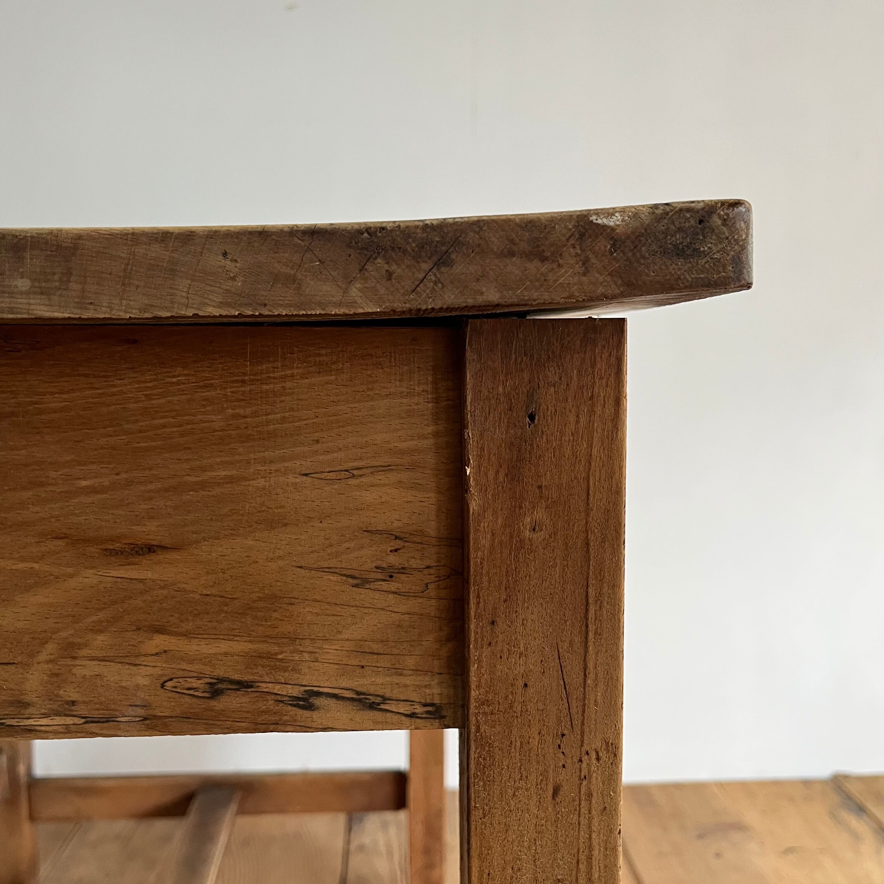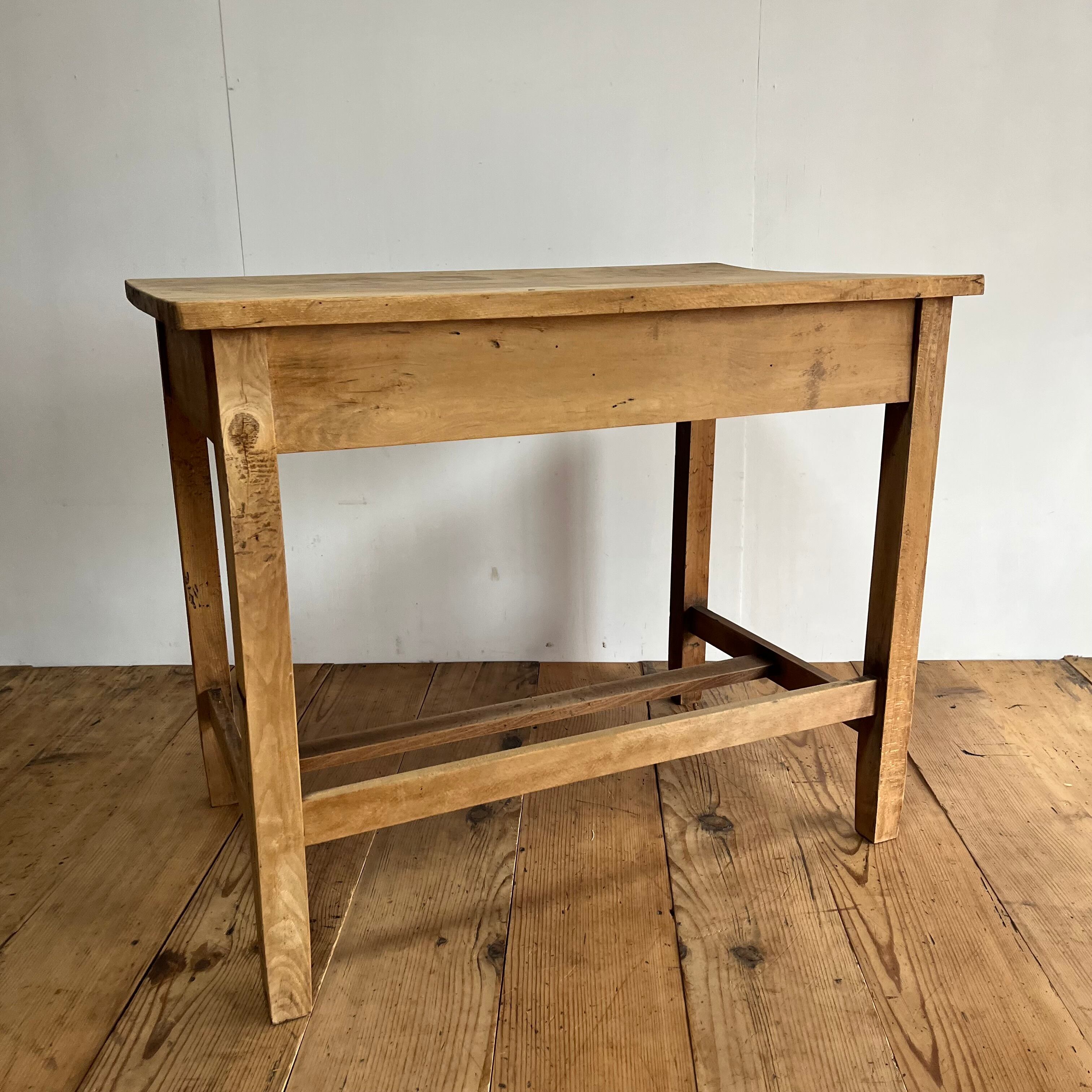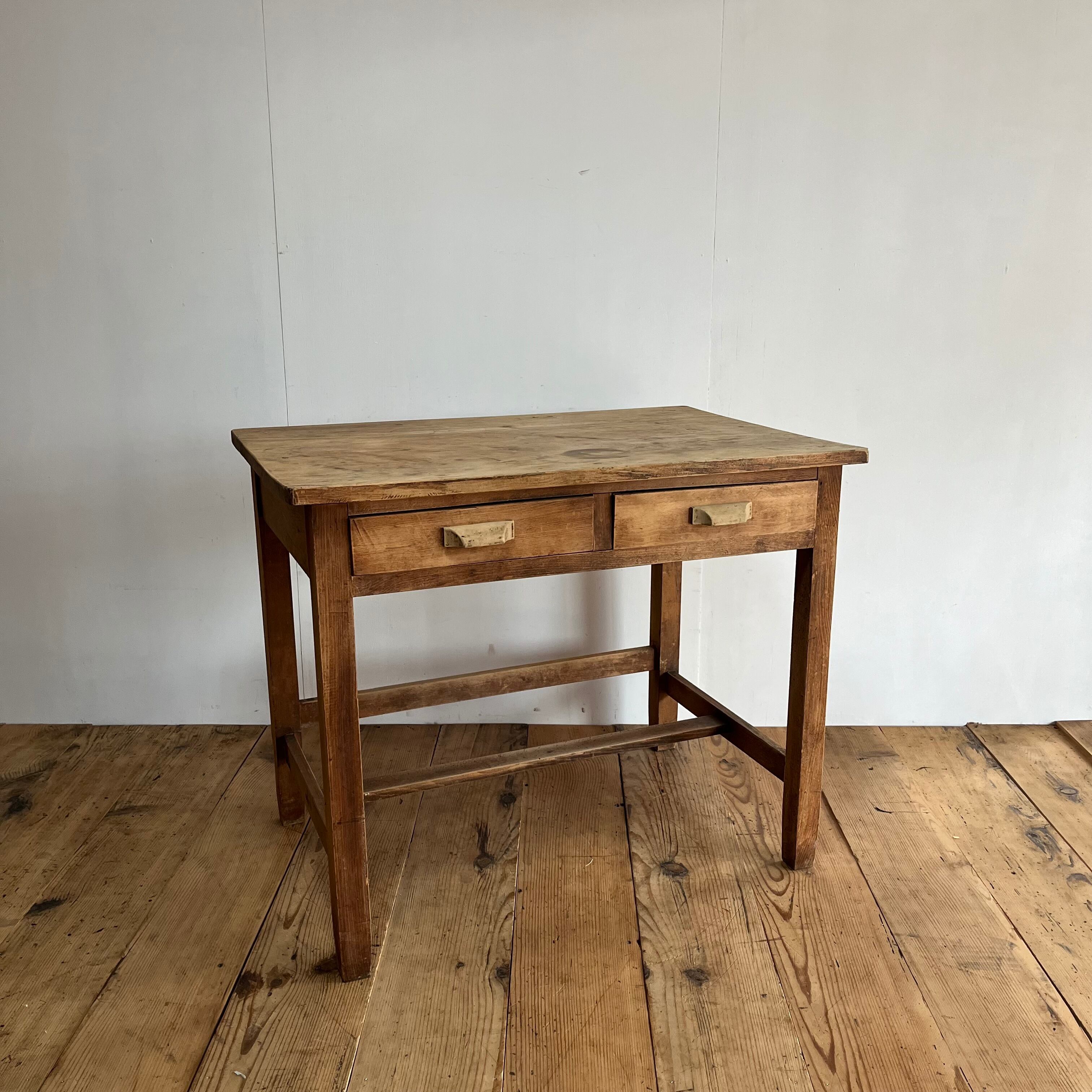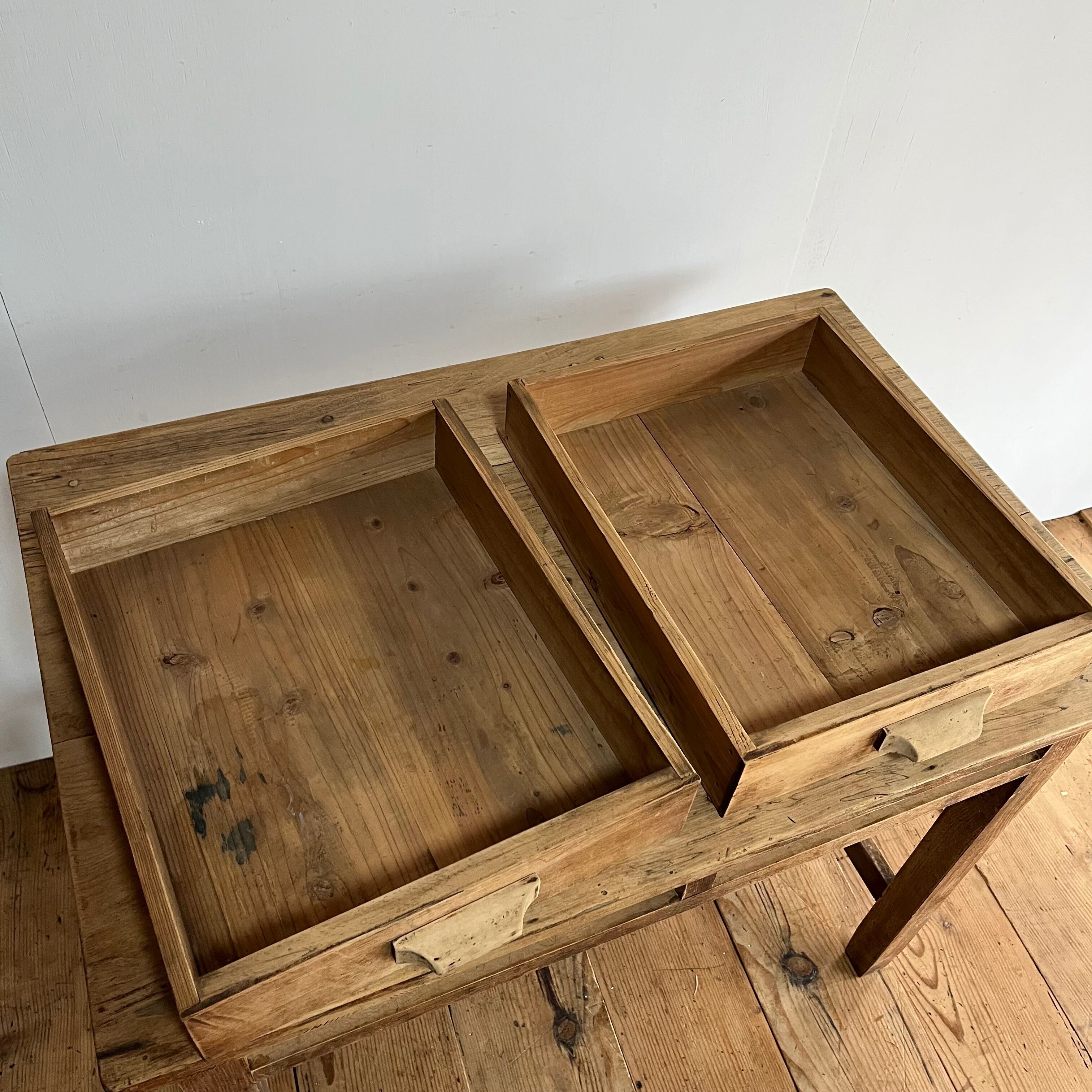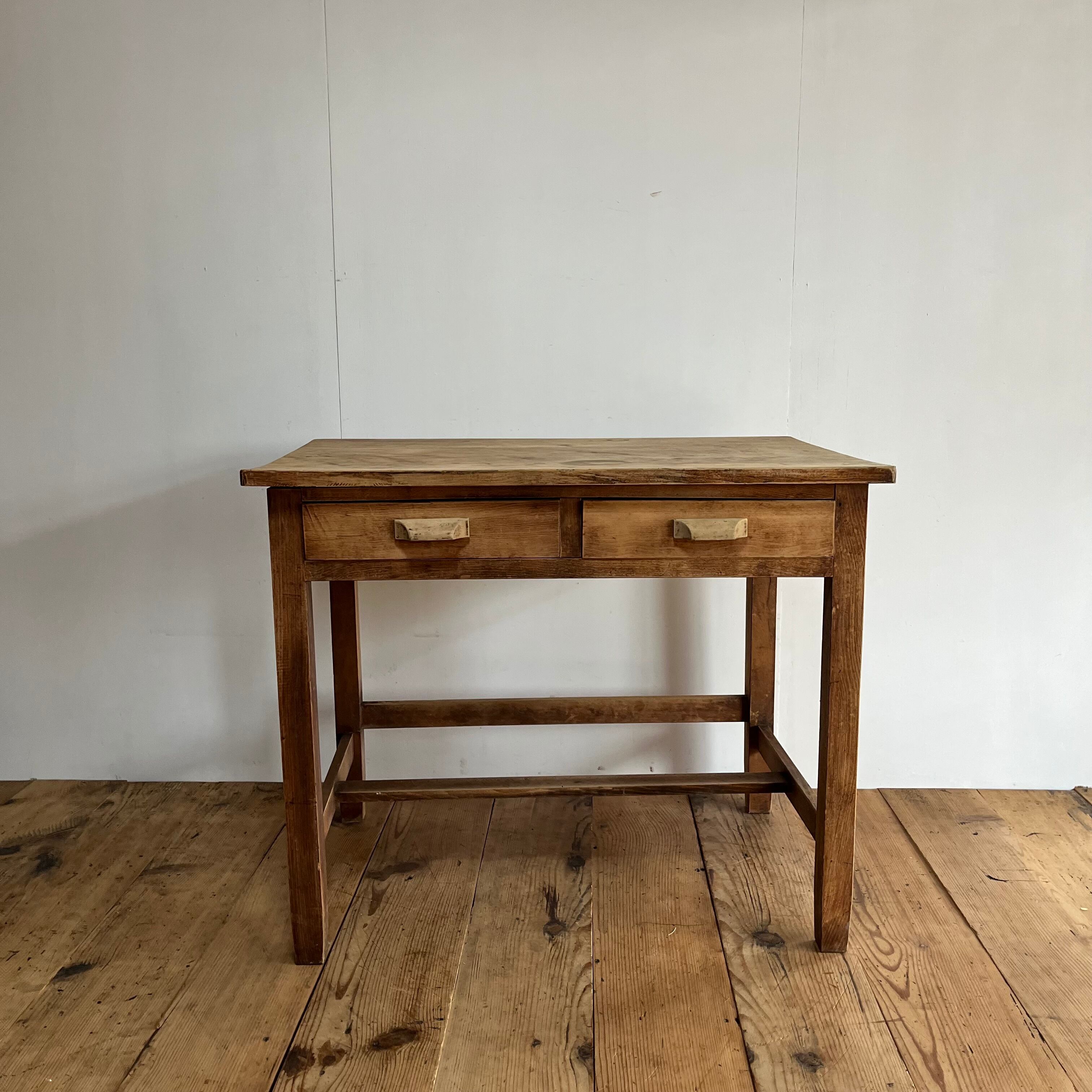 全体に傷みあり。虫食い跡あり。天板に反りあり。引き出しの開閉はスムーズです。