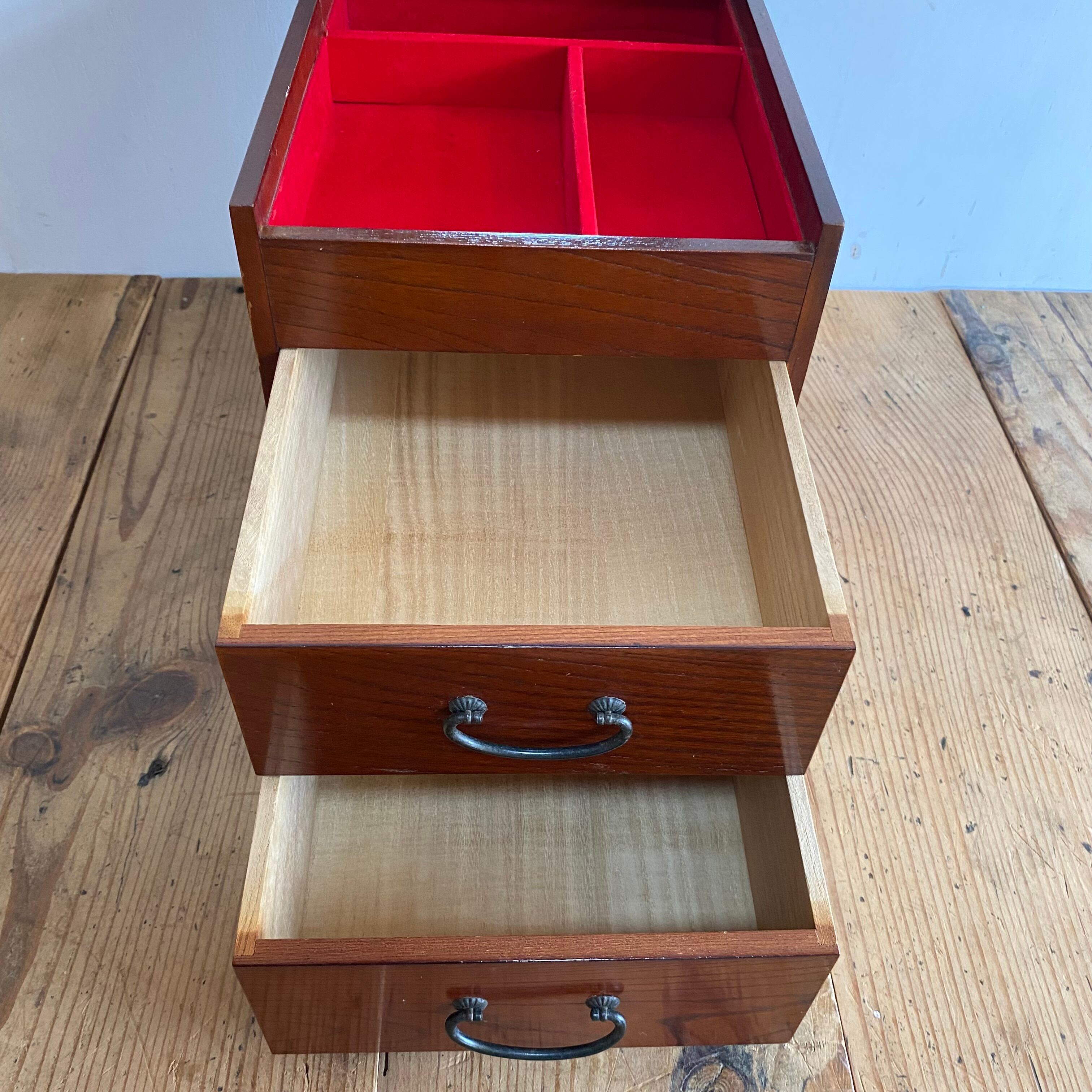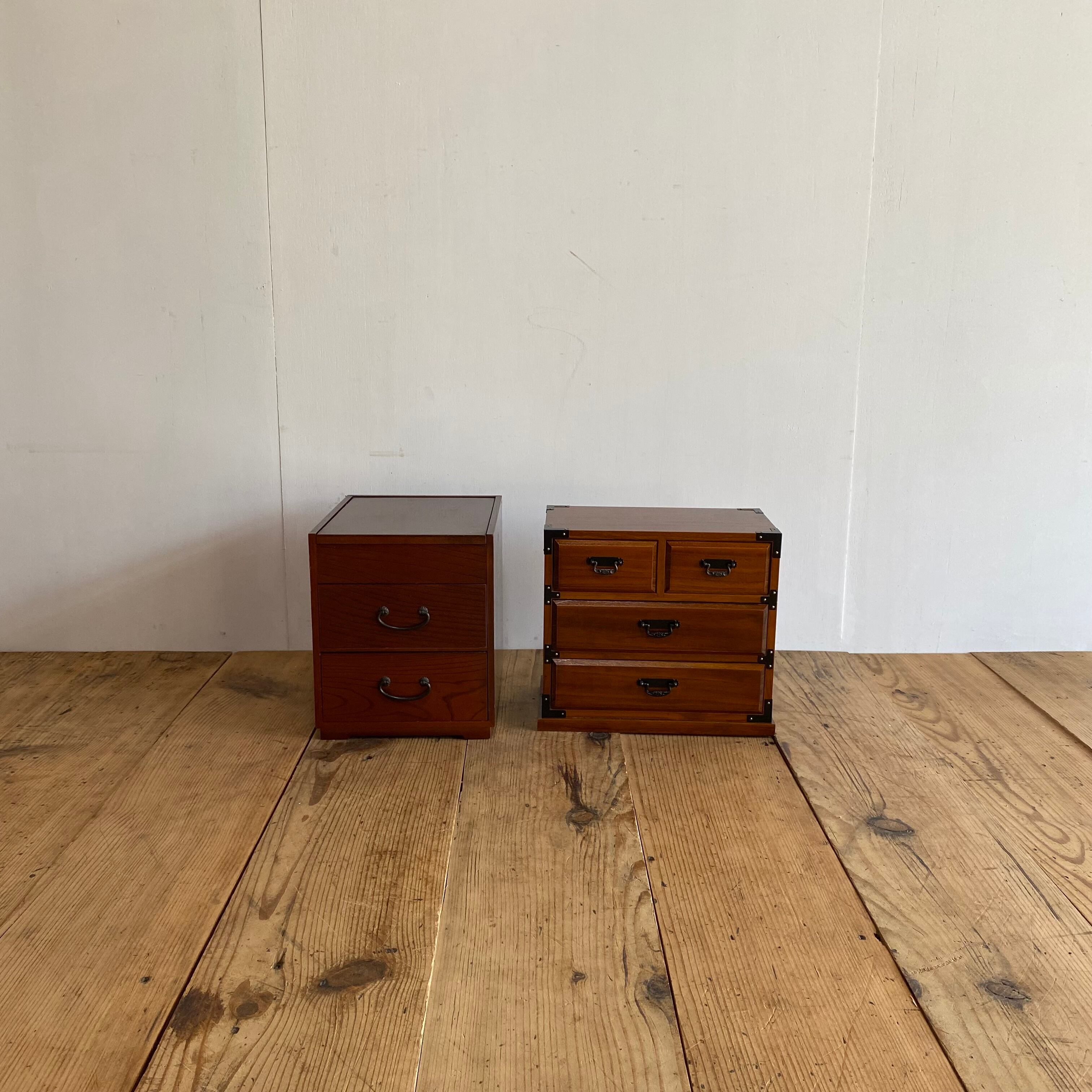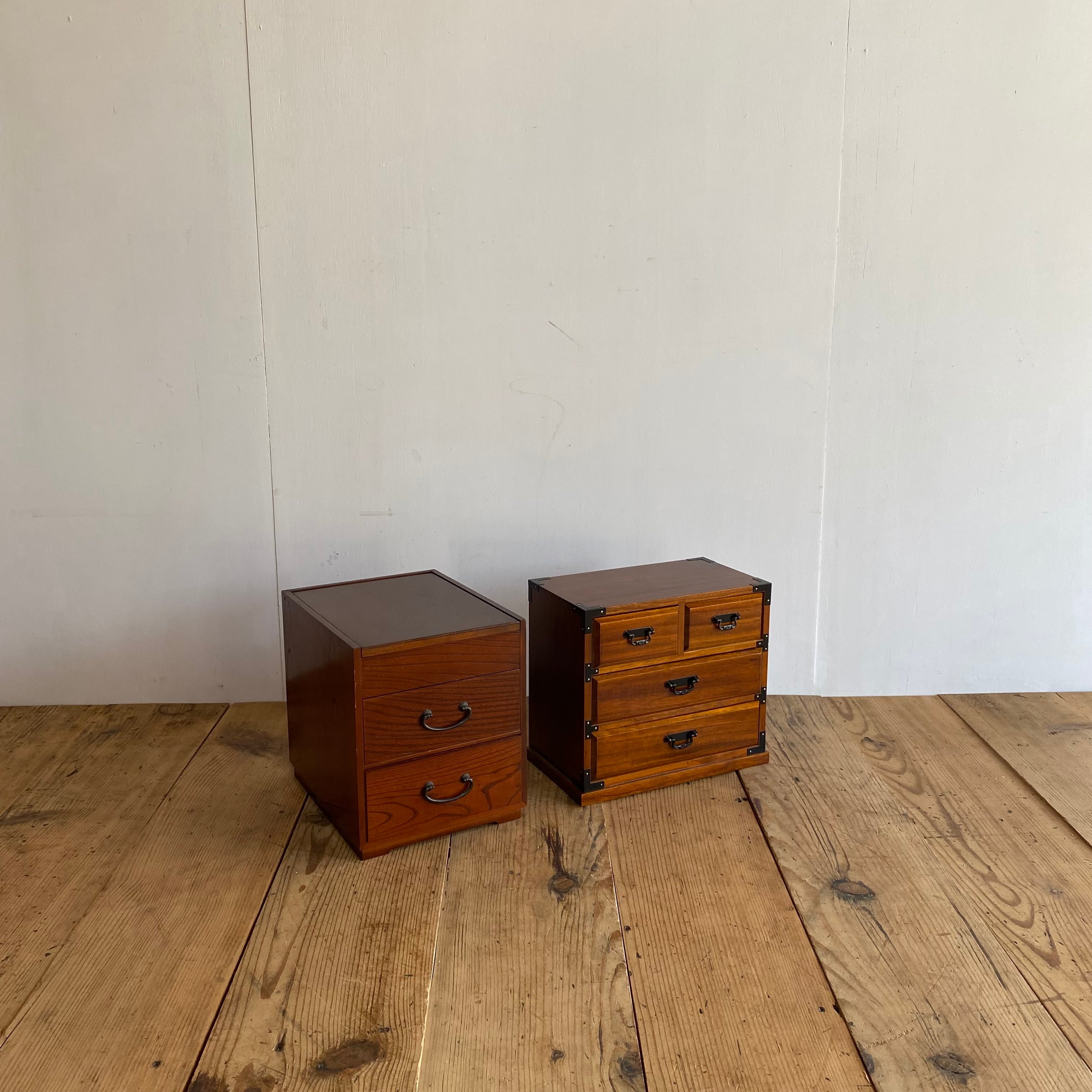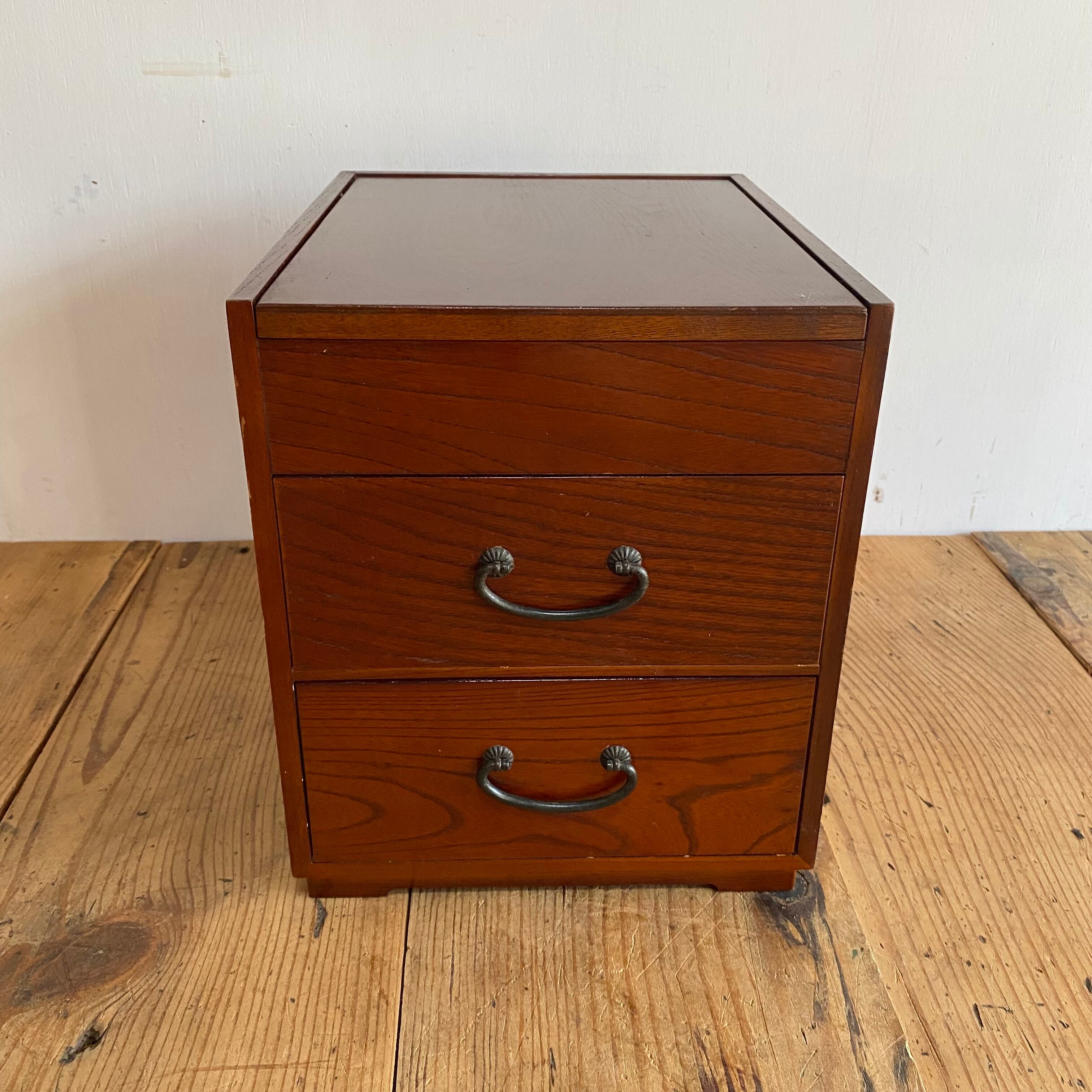 無垢材を使用した、昭和レトロな2点セットの小引き出しです。裁縫箱としてはもちろん、小物入れとしても便利にお使いいただけます。