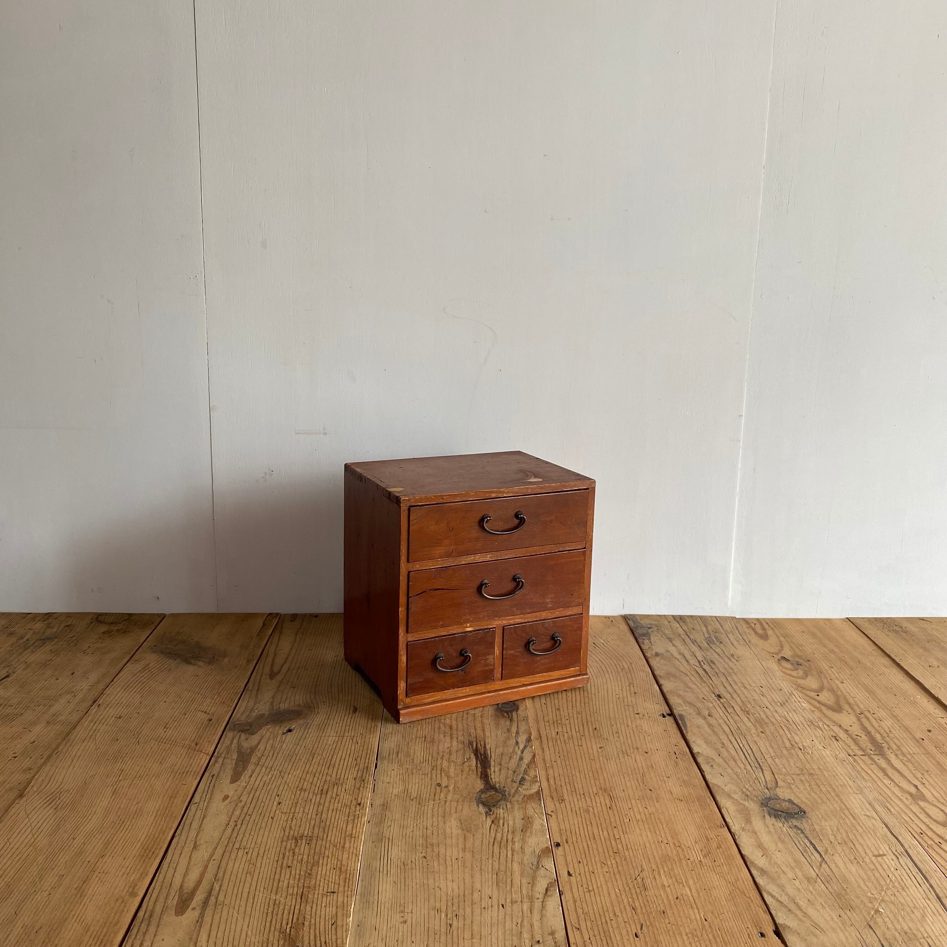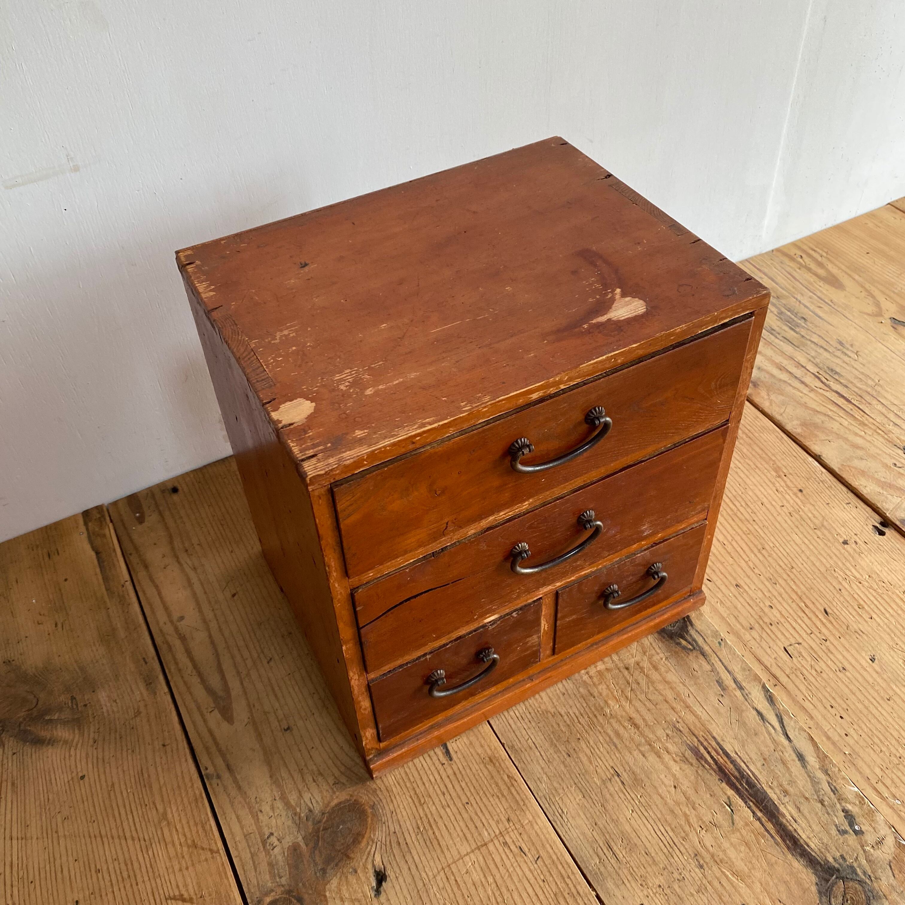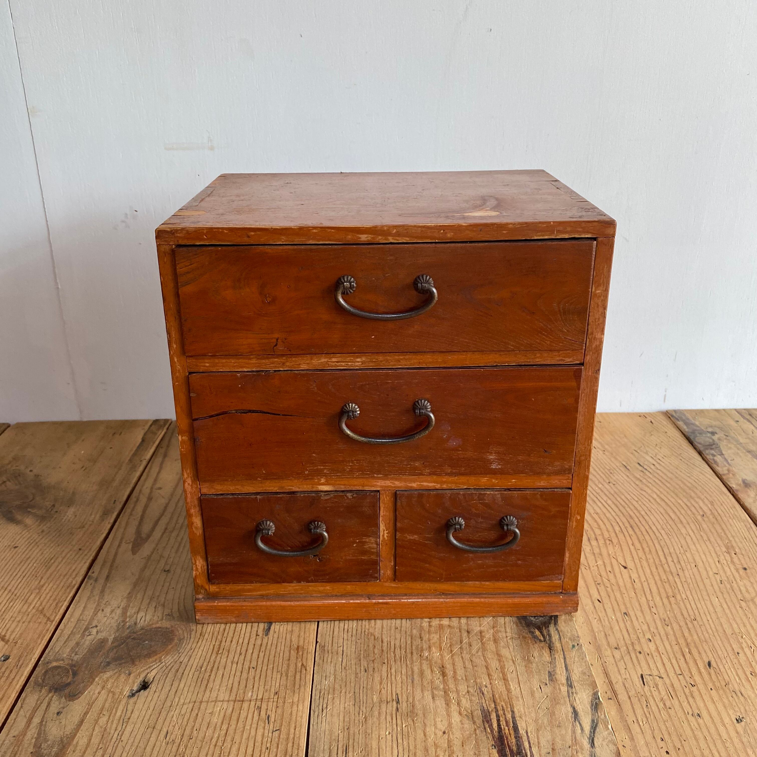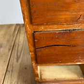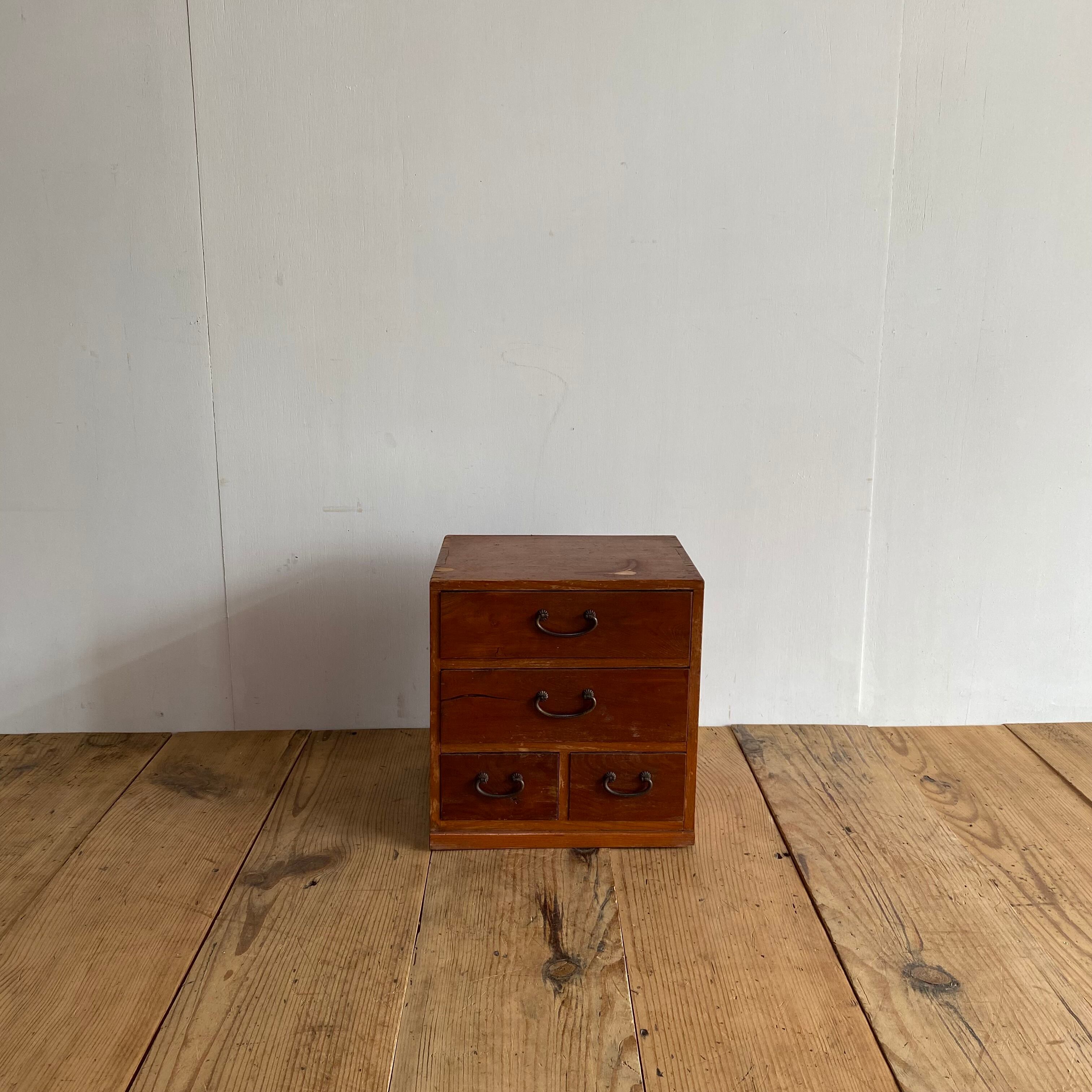 無垢材を使用した、魅力あふれるアンティーク小引き出しです。レトロなデザインは、お部屋のインテリアを引き立てるだけでなく、収納力も抜群です。4杯の引き出しが、様々な小物を整理整頓するのに便利です。時間が経つごとに深まる無垢材の風合いを楽しみながら、ぜひご愛用ください。全体的に丁寧に洗浄されており、安心してお使いいただけます。