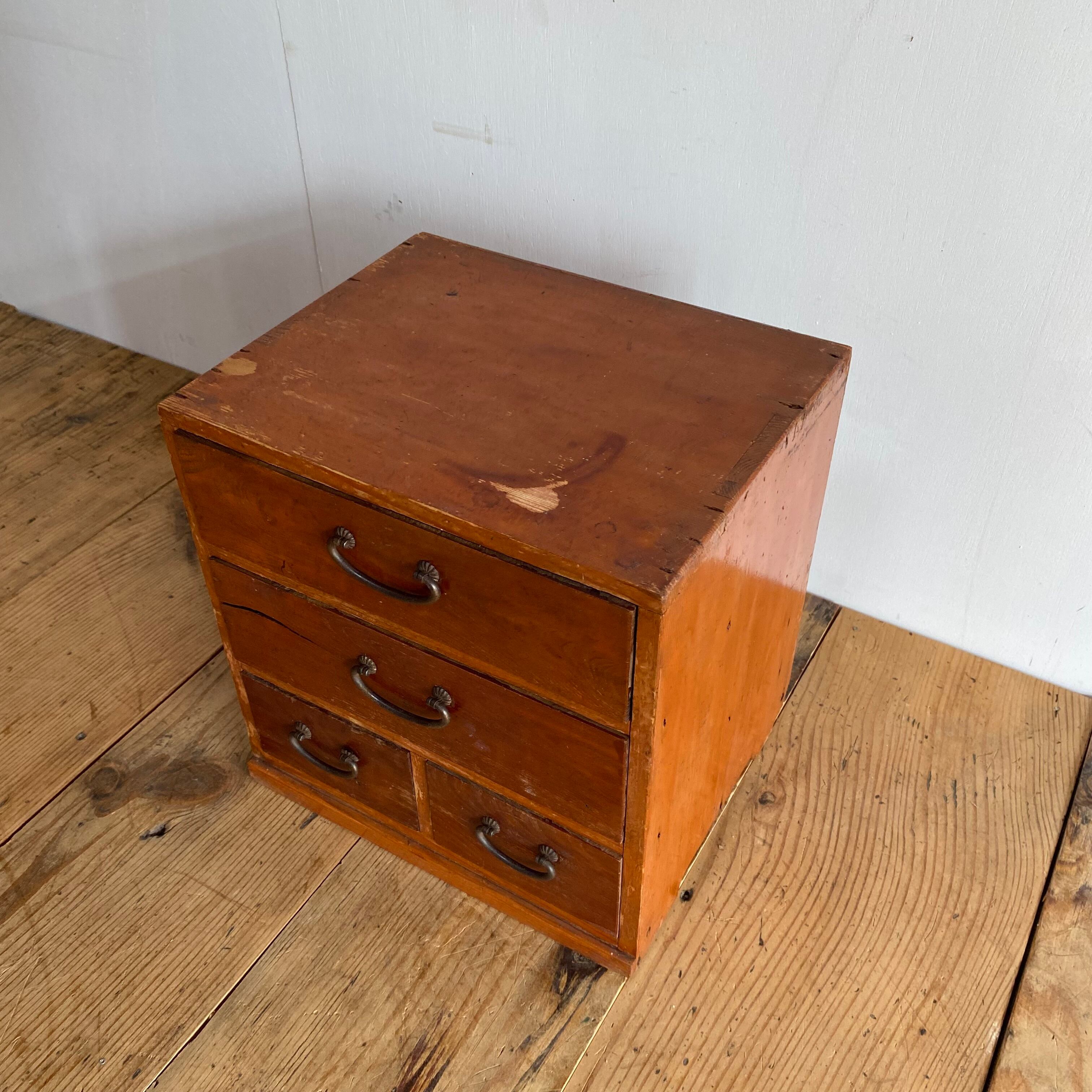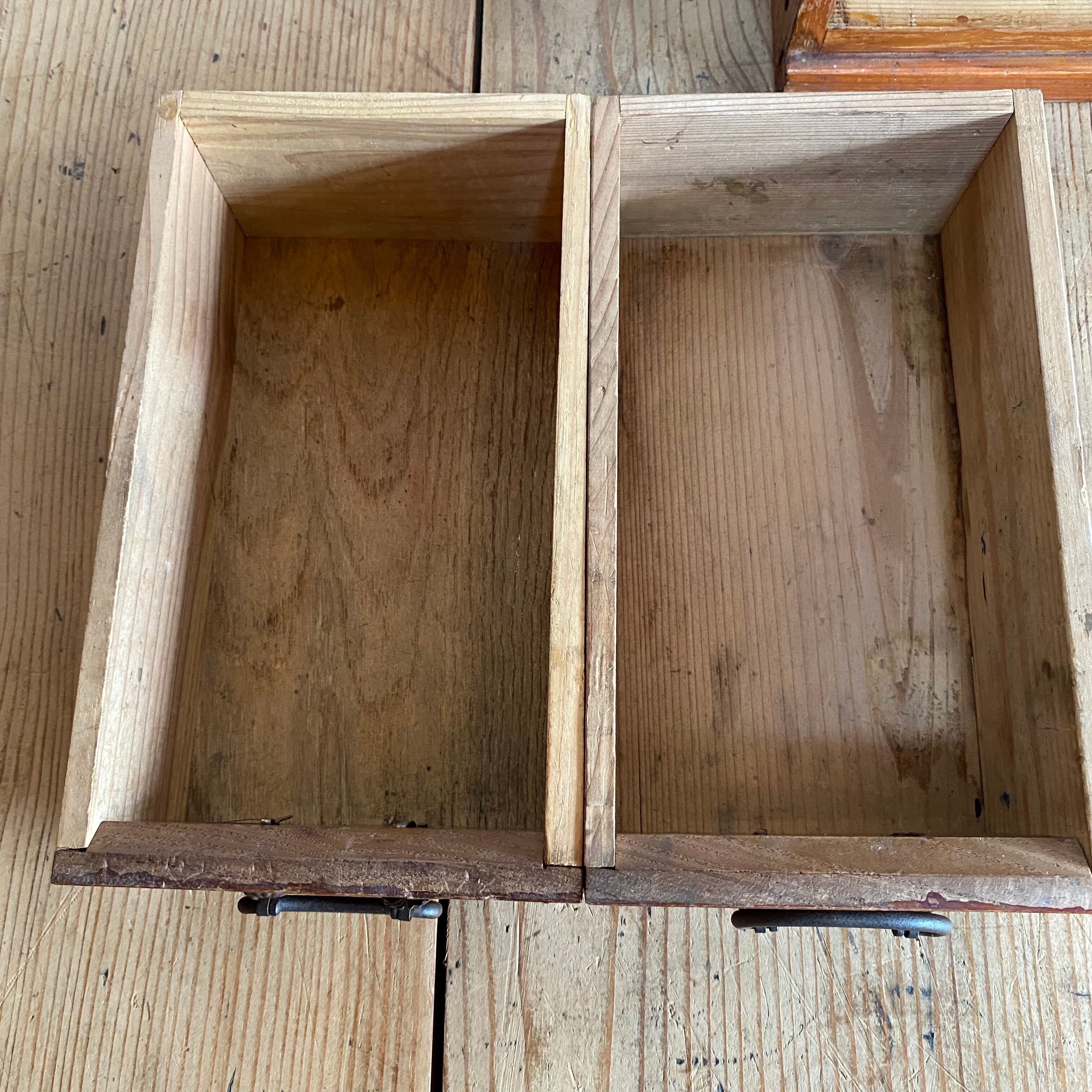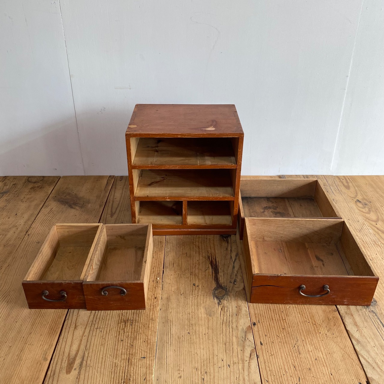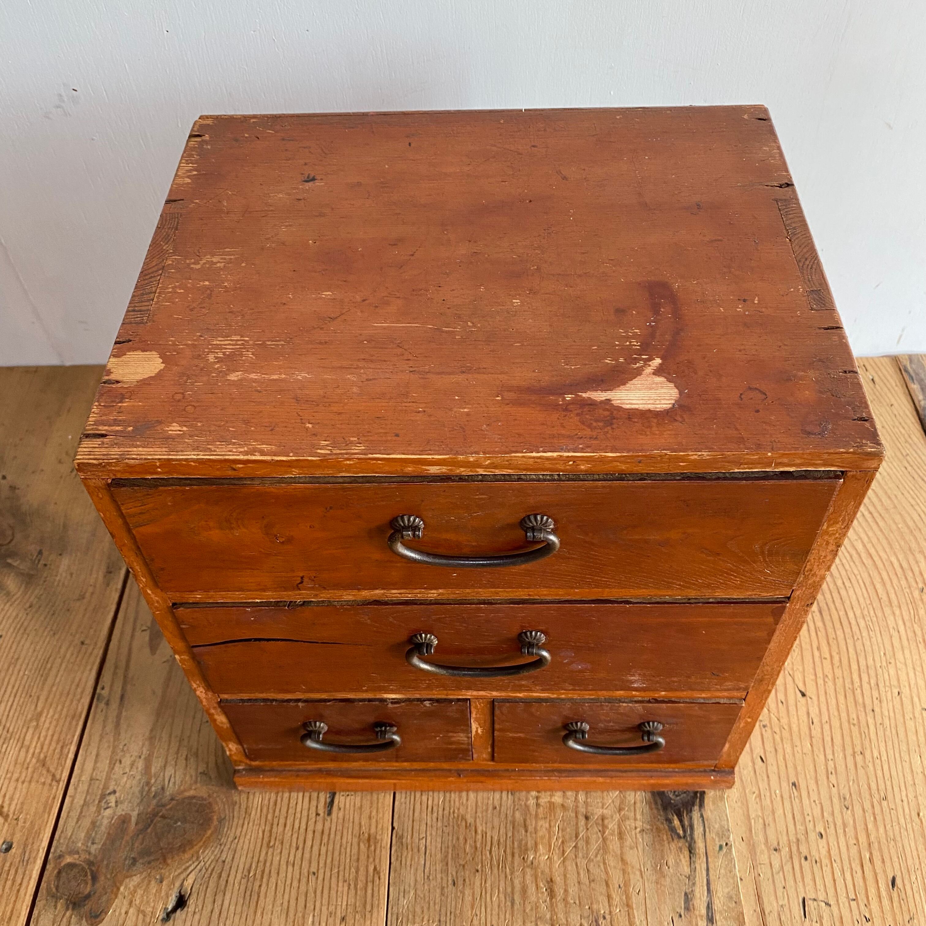 無垢材を使用した、魅力あふれるアンティーク小引き出しです。レトロなデザインは、お部屋のインテリアを引き立てるだけでなく、収納力も抜群です。4杯の引き出しが、様々な小物を整理整頓するのに便利です。時間が経つごとに深まる無垢材の風合いを楽しみながら、ぜひご愛用ください。全体的に丁寧に洗浄されており、安心してお使いいただけます。