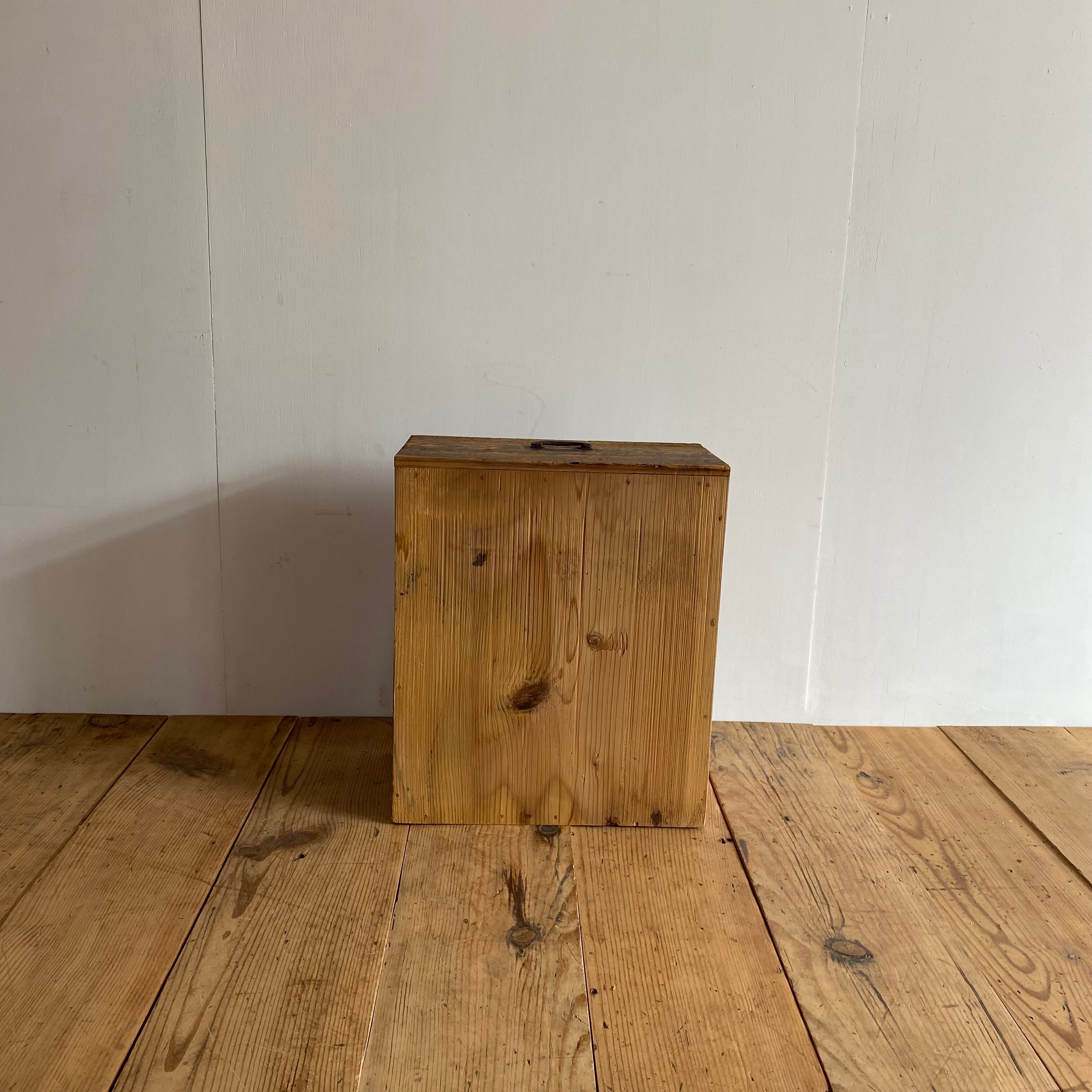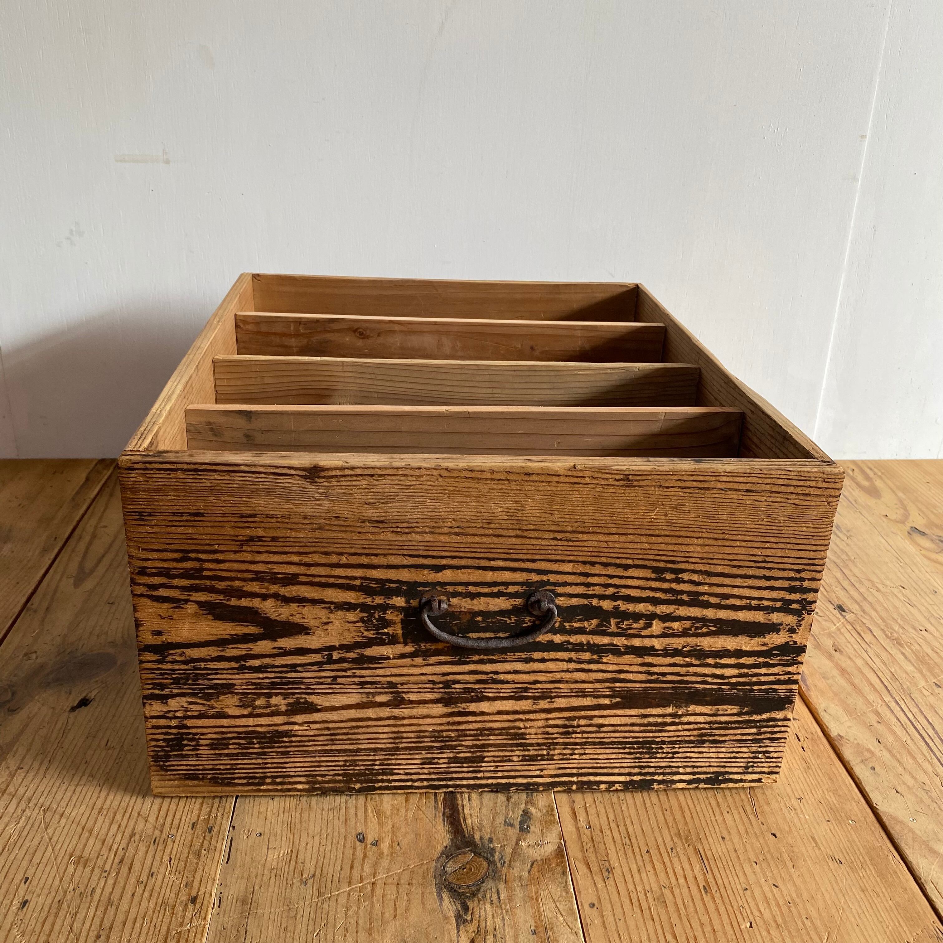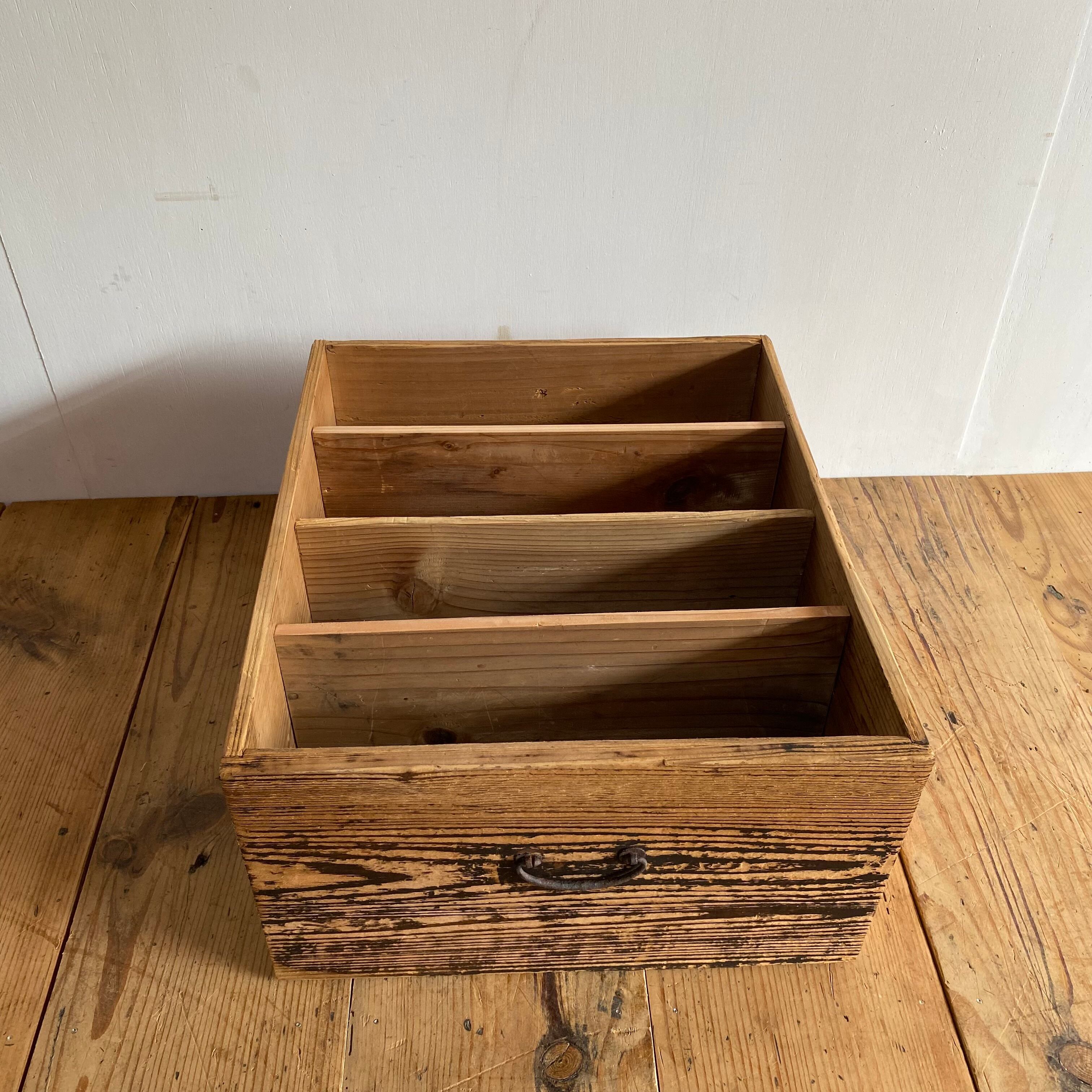 無垢材を使用した、魅力的なアンティーク木材棚です。取っ手付きのシンプルなデザインは、食器棚や小物入れとして非常に便利です。経年による風合いを感じられ、使うほどにその魅力が引き立ちます。無塗装仕上げのため、素材そのものの温もりをお楽しみいただける一点です。丁寧に洗浄されており、安心してご使用いただけます。